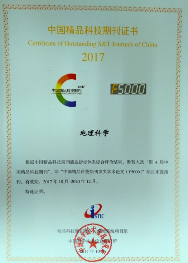 2017年10月31日,中國科學技術信息研究所在北京國際會議中心舉辦了“2017年中國科技論文統計結果發布會”。東北地理所主辦的期刊《地理科學》和《Chinese Geographical Science》分別入選“第4屆中國精品科技期刊”和“第4屆中國國際化精品科技期刊”,即“中國精品科技期刊頂尖學術論文(F5000)”項目來源期刊,有效期為2017年10月—2020年12月。