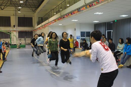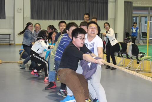 拔河比賽實行循環賽制,各小隊代表以現場抽簽的方式決定比賽次序。隨著一聲哨響,雙方隊員緊握長繩,雙腳蹬地,身體向后傾斜,奮力向自己的方向拉動長繩。選手們的吶喊聲,啦啦隊的歡呼聲,響徹體育館的上空。在“我運動、我快樂”和“友誼第一,比賽第二”的體育精神鼓舞下,整場比賽熱烈進行。