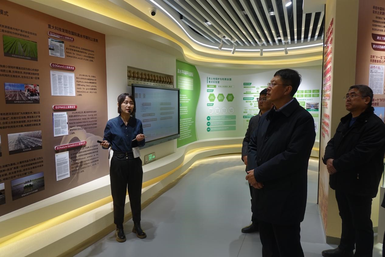 隨后參觀了“黑土糧倉”科技會戰指揮中心宣傳展示平臺,辦公室副主任殷麗婭對研究所歷史沿革、基本概況、科研項目、人才智庫、平臺建設、黨建創新等方面內容進行了講解。